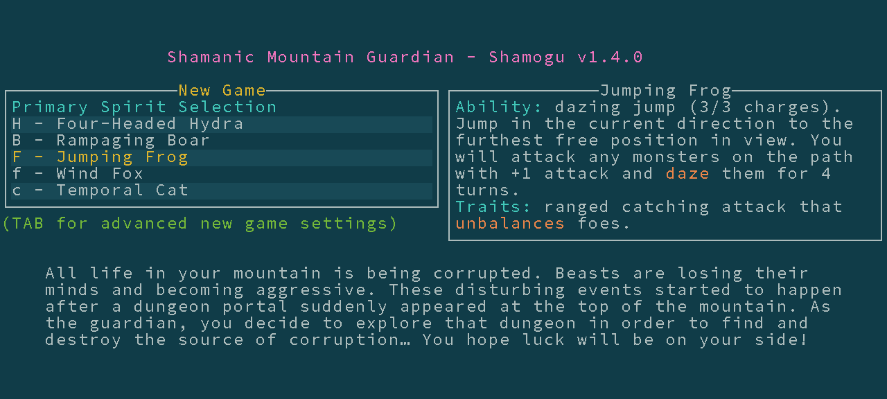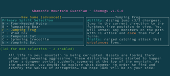 Shamanic Mountain Guardian (Shamogu) is a coffee-break roguelike game with a focus on tactical movement and careful timing of totemic spirit invocation and comestible consumption. Visibility and noise stealth mechanics also play an important role.